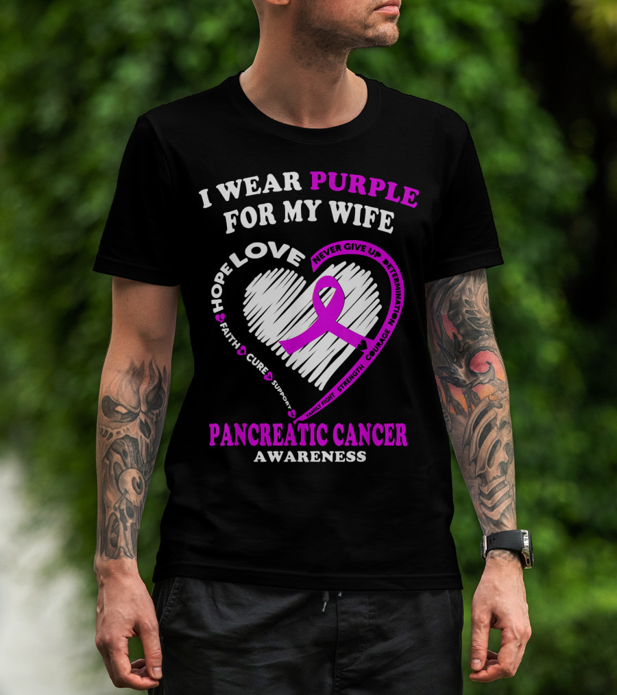 I Wear Purple For My Wife Love Hope Faith Cure Support Never Give Up Determination Family Fight Strength Courage Inspire Pancreatic Cancer Awareness T-Shirt