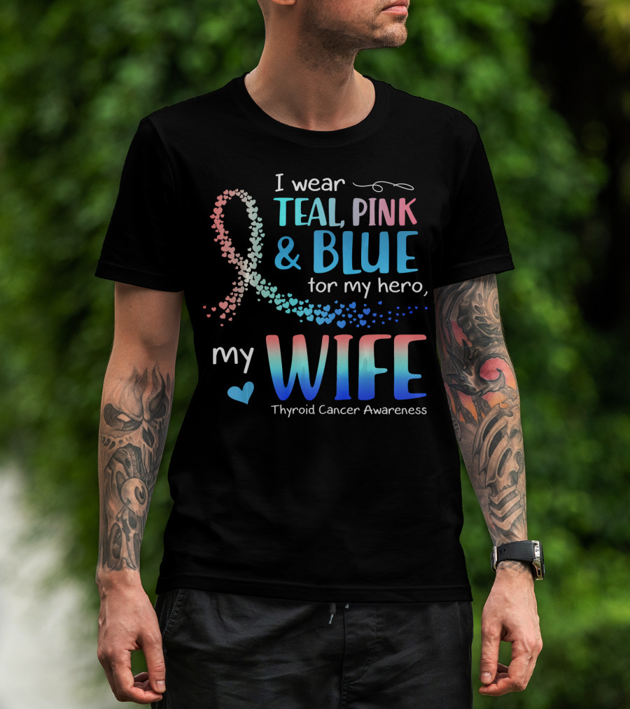 I Wear Teal Pink Blue For My Hero My Wife Thyroid Cancer Awareness T-Shirt