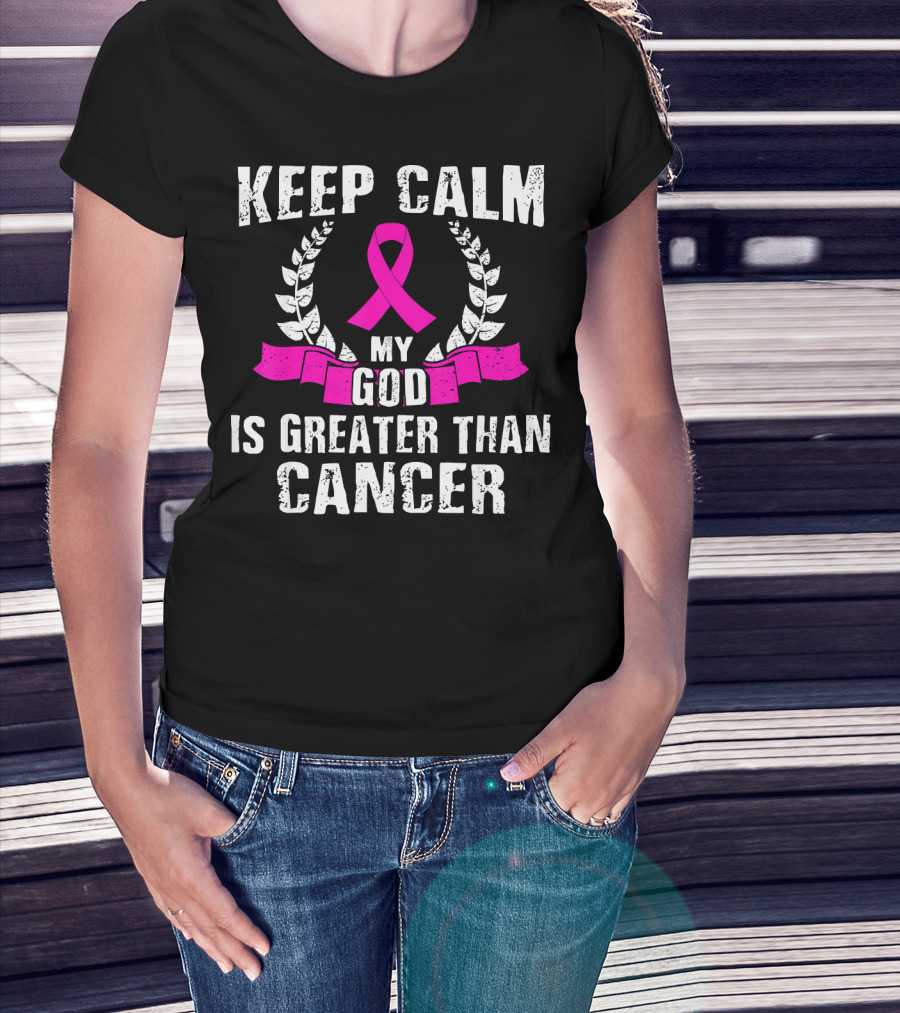 Keep Calm My God Is Greater Than Cancer Breast Cancer Awareness Che T-Shirt