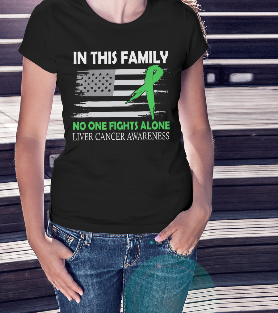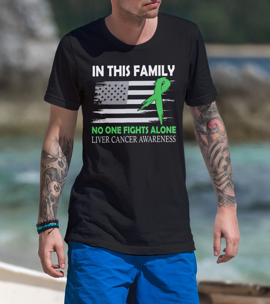 In This Family No One Fights Alone Liver Cancer Awareness American Flag Green T-Shirt