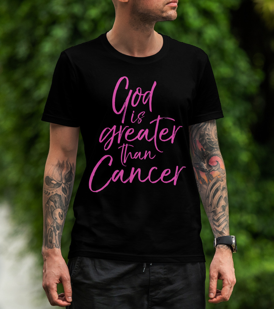 The God is Greater Than Cancer Breast T-shirt is designed for everyday wear and a consistent fit. Fabric is pre-shrunk ring-spun cotton with durable stitching. See the size chart below for exact measurements.