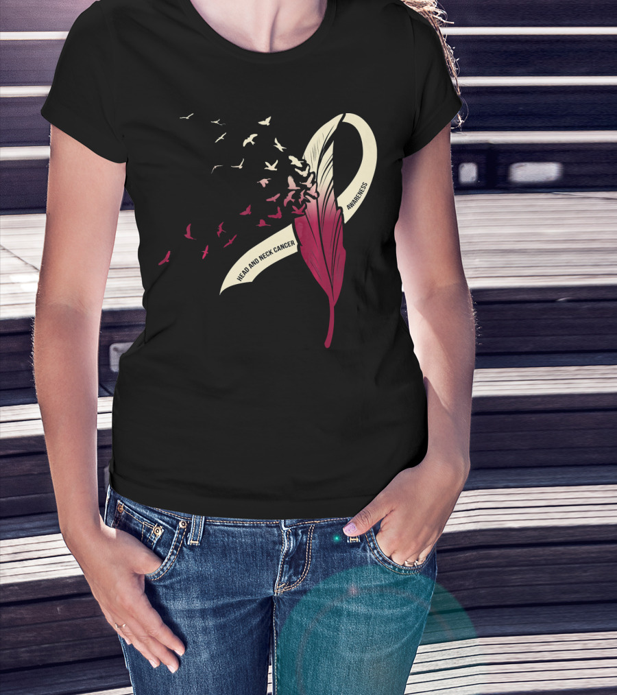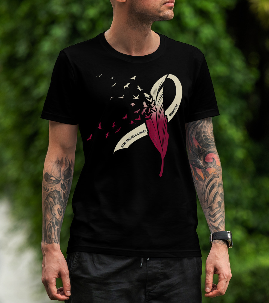 Head And Neck Cancer Awareness Feather Ribbon With Birds T-Shirt