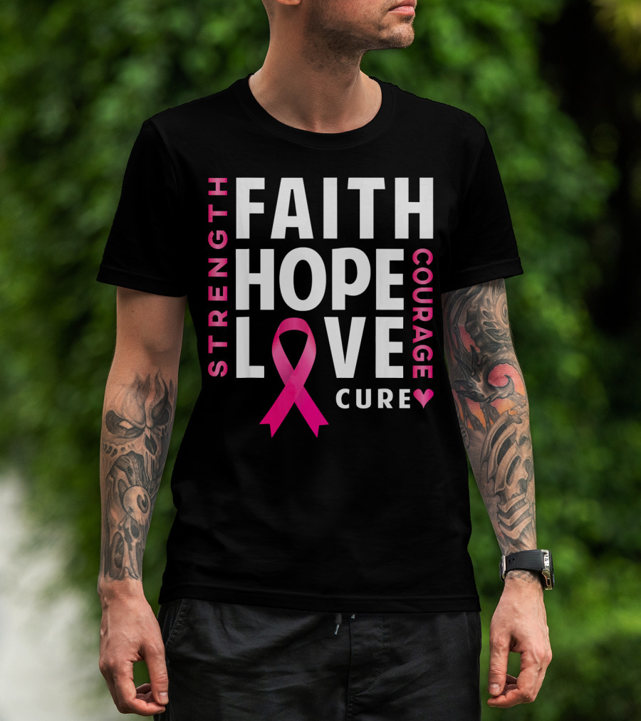 Faith Hope Love Pink Ribbon Strength Courage Cure Breast Cancer Awareness T-Shirt
