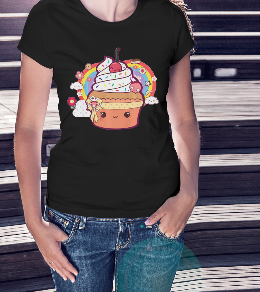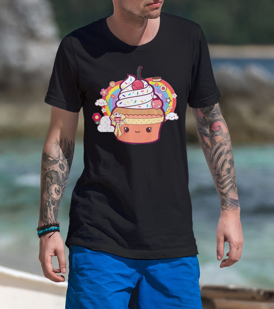 Funny Kawaii Chibi Cupcake With Rainbow And Cute Food Elements T-Shirt