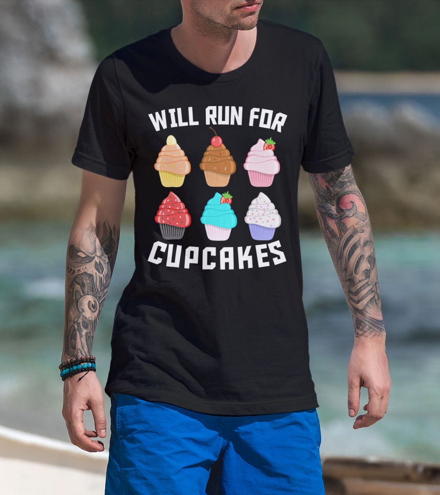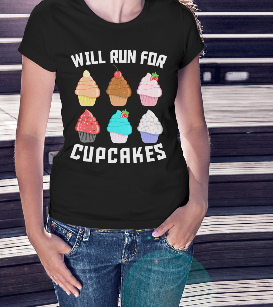 Will Run For Cupcakes Funny Runner Cupcake Desserts With Cherry And Strawberries T-Shirt