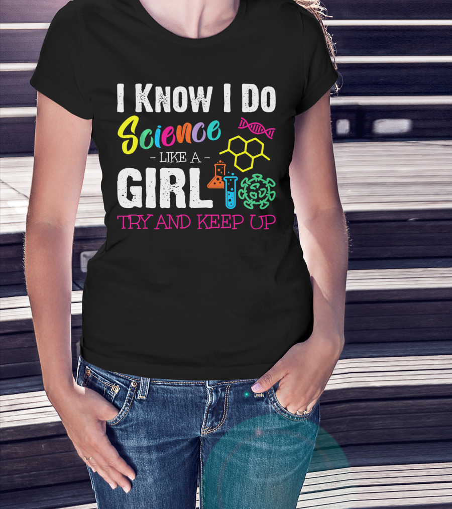 I Know I Do Science Like A Girl Try And Keep Up DNA Molecule Lab Beaker Chemistry T-Shirt