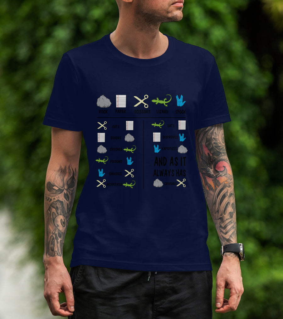 The Rock Paper Scissors Lizard Spock and As It Always Has T-shirt is designed for everyday wear and a consistent fit. Fabric is pre-shrunk ring-spun cotton with durable stitching. See the size chart below for exact measurements.