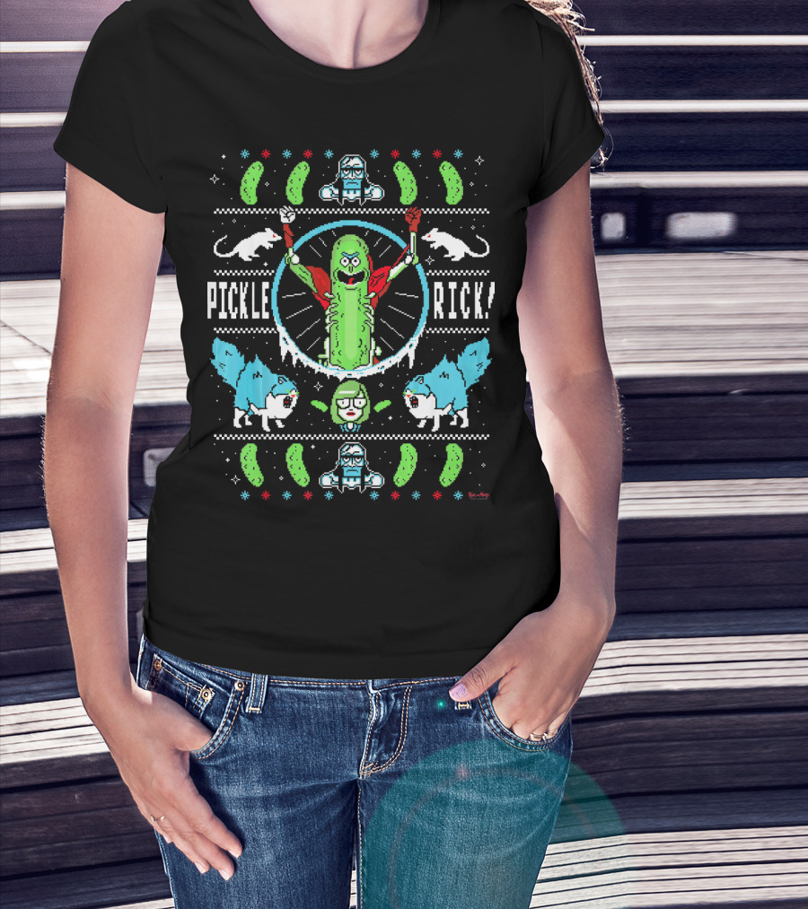 The Festive Pickle Rick Ugly Sweater Christmas Theme with Rick and Morty Cats and Snowflakes T-shirt is designed for everyday wear and a consistent fit. Fabric is pre-shrunk ring-spun cotton with durable stitching. See the size chart below for exact measurements.
