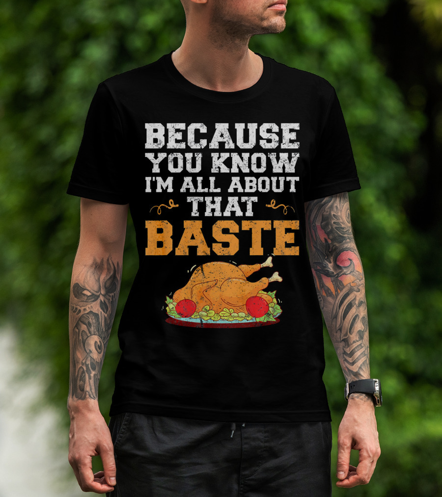 The Because You Know I'm All About That Baste Turkey Pun T-shirt is designed for everyday wear and a consistent fit. Fabric is pre-shrunk ring-spun cotton with durable stitching. See the size chart below for exact measurements.