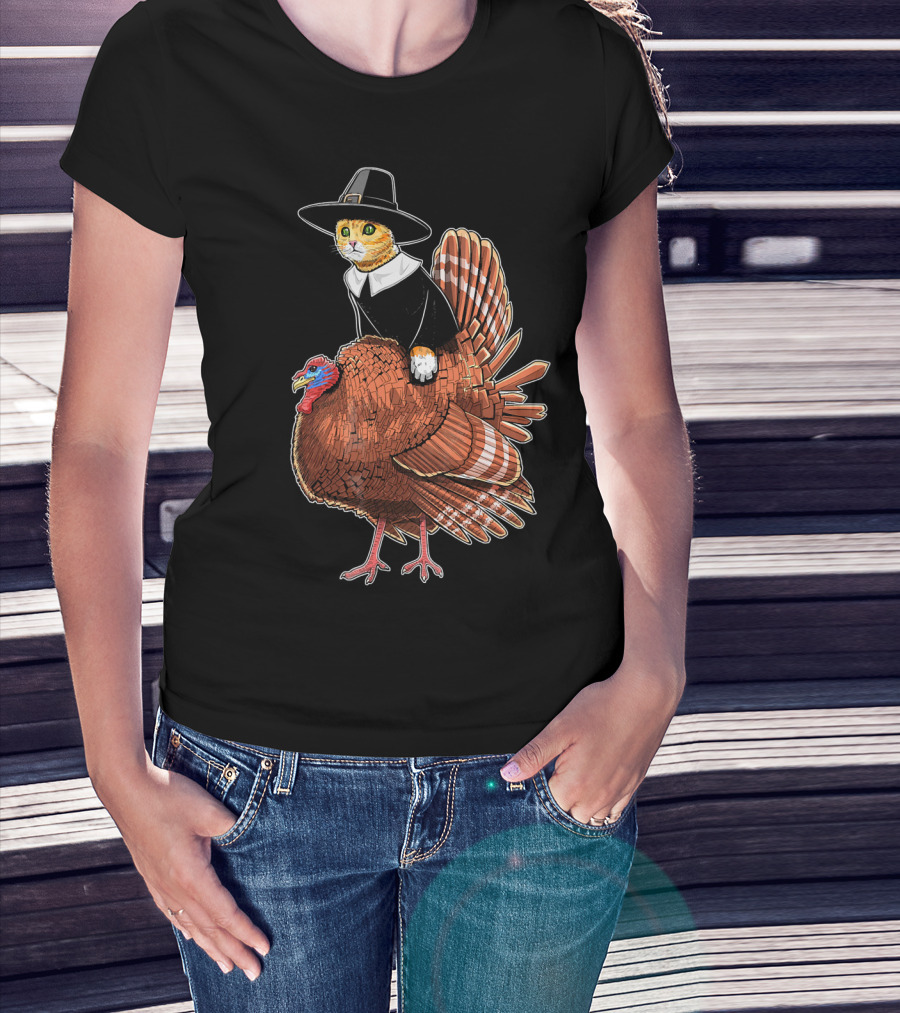 Thanksgiving Cat Dressed As Pilgrim Riding Turkey T-Shirt