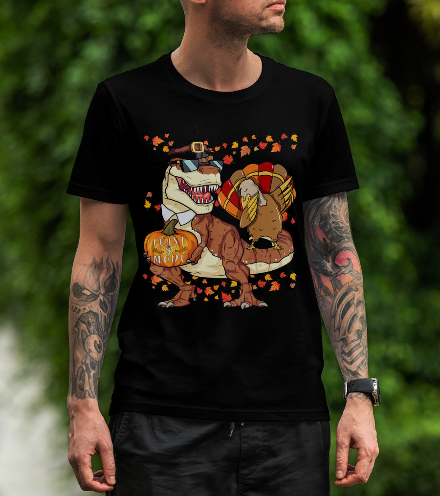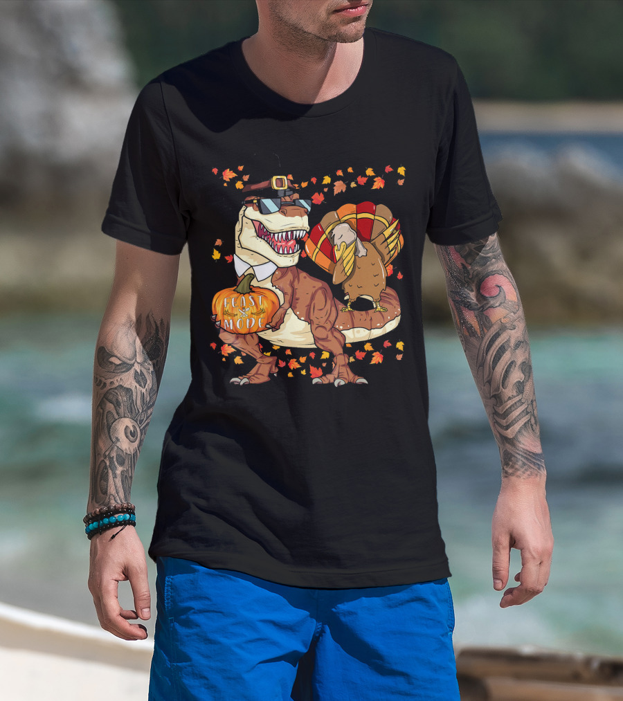 Thanksgiving Feast Mode Dinosaur With Turkey And Autumn Leaves T-Shirt