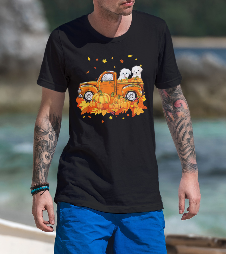 Maltese Dogs Riding Pumpkin Truck For Halloween T-Shirt