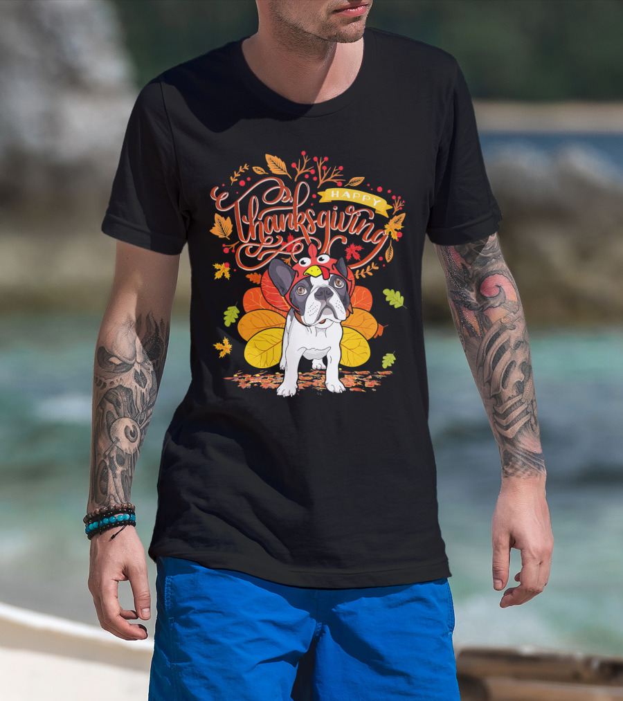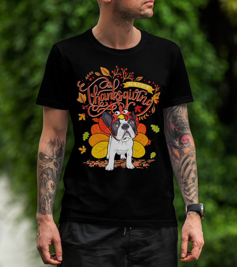 The Happy Thanksgiving French Bulldog with Turkey Hat and Fall Leaves T-shirt is designed for everyday wear and a consistent fit. Fabric is pre-shrunk ring-spun cotton with durable stitching. See the size chart below for exact measurements.