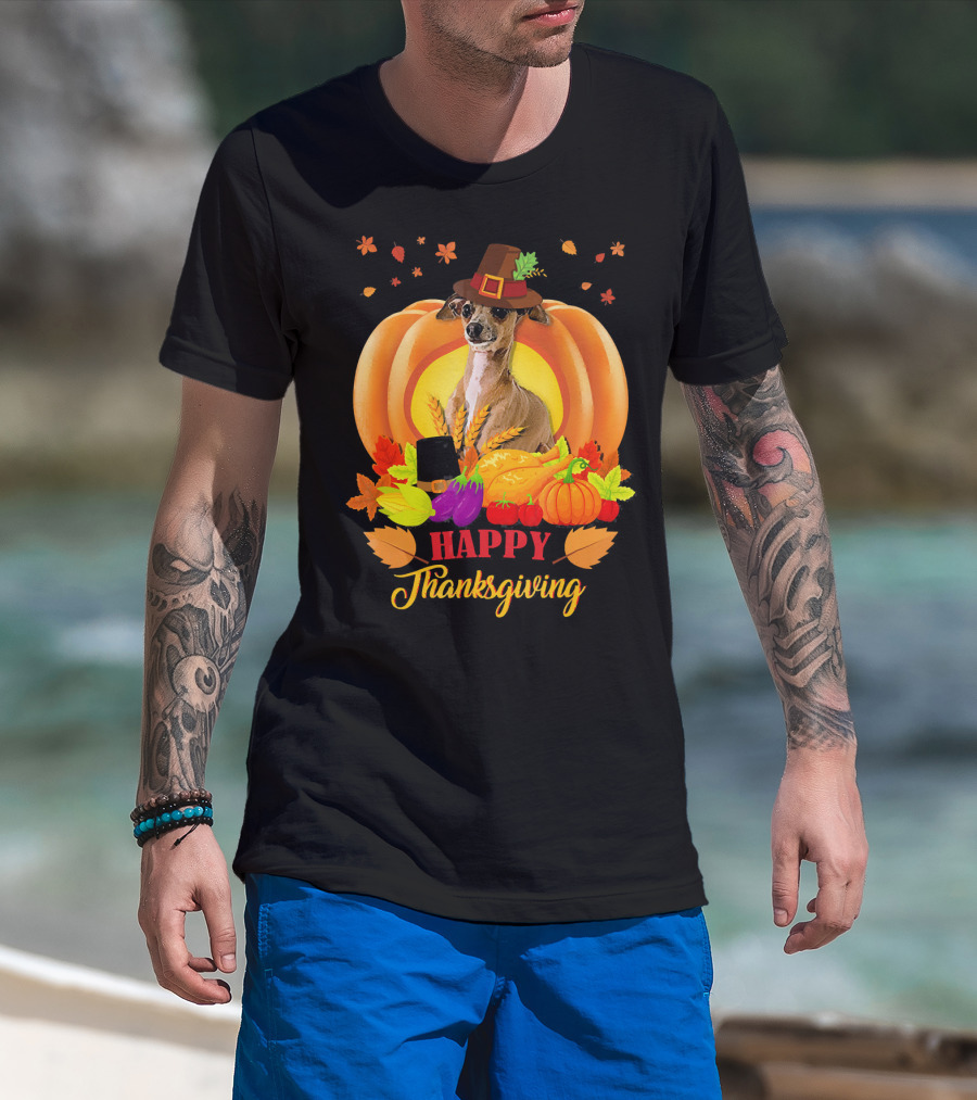 Italian Greyhound Happy Thanksgiving Pilgrim Hat Pumpkin Leaves T-Shirt