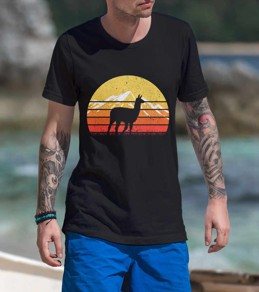The Retro Vintage Alpaca Silhouette Sunset Mountain Scene T-shirt is designed for everyday wear and a consistent fit. Fabric is pre-shrunk ring-spun cotton with durable stitching. See the size chart below for exact measurements.