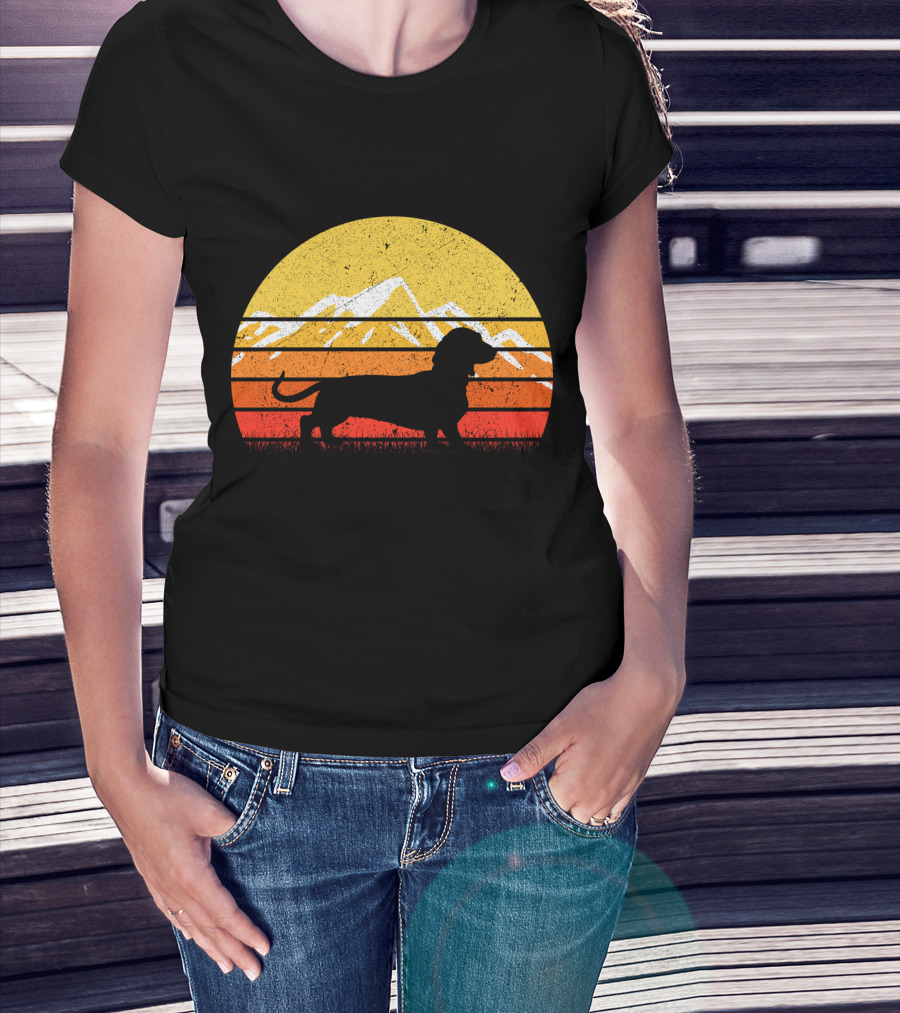 The Retro Vintage Dachshund Dog Silhouette Sunset Mountains T-shirt is designed for everyday wear and a consistent fit. Fabric is pre-shrunk ring-spun cotton with durable stitching. See the size chart below for exact measurements.