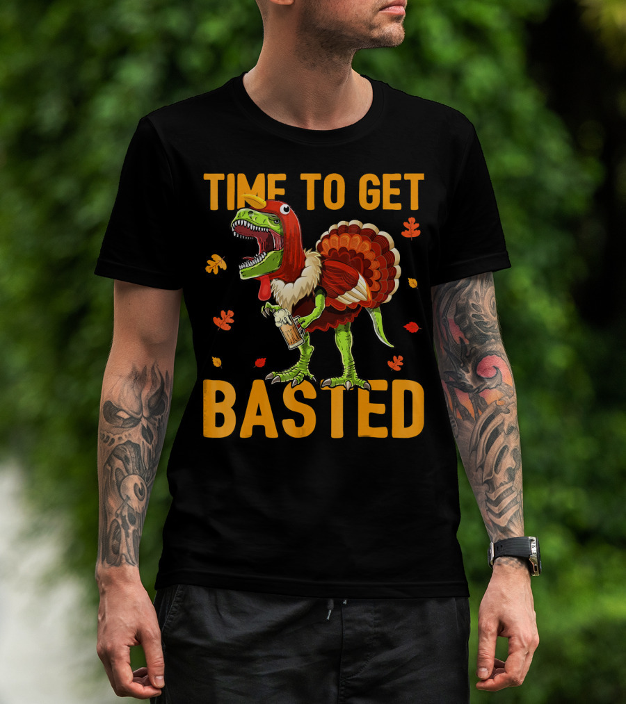 Time To Get Basted Thanksgiving Dinosaur With Turkey Costume And Beer T-Shirt