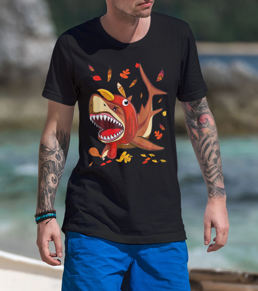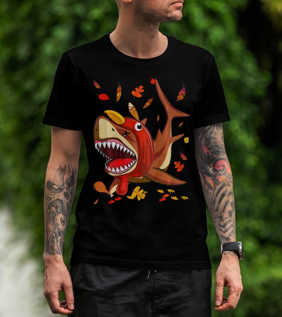 Thanksgiving Shark Doo Doo Doo Turkey Costume With Fall Leaves T-Shirt