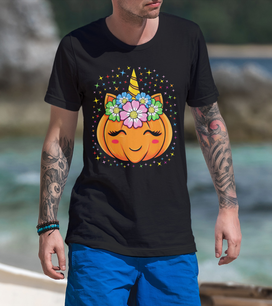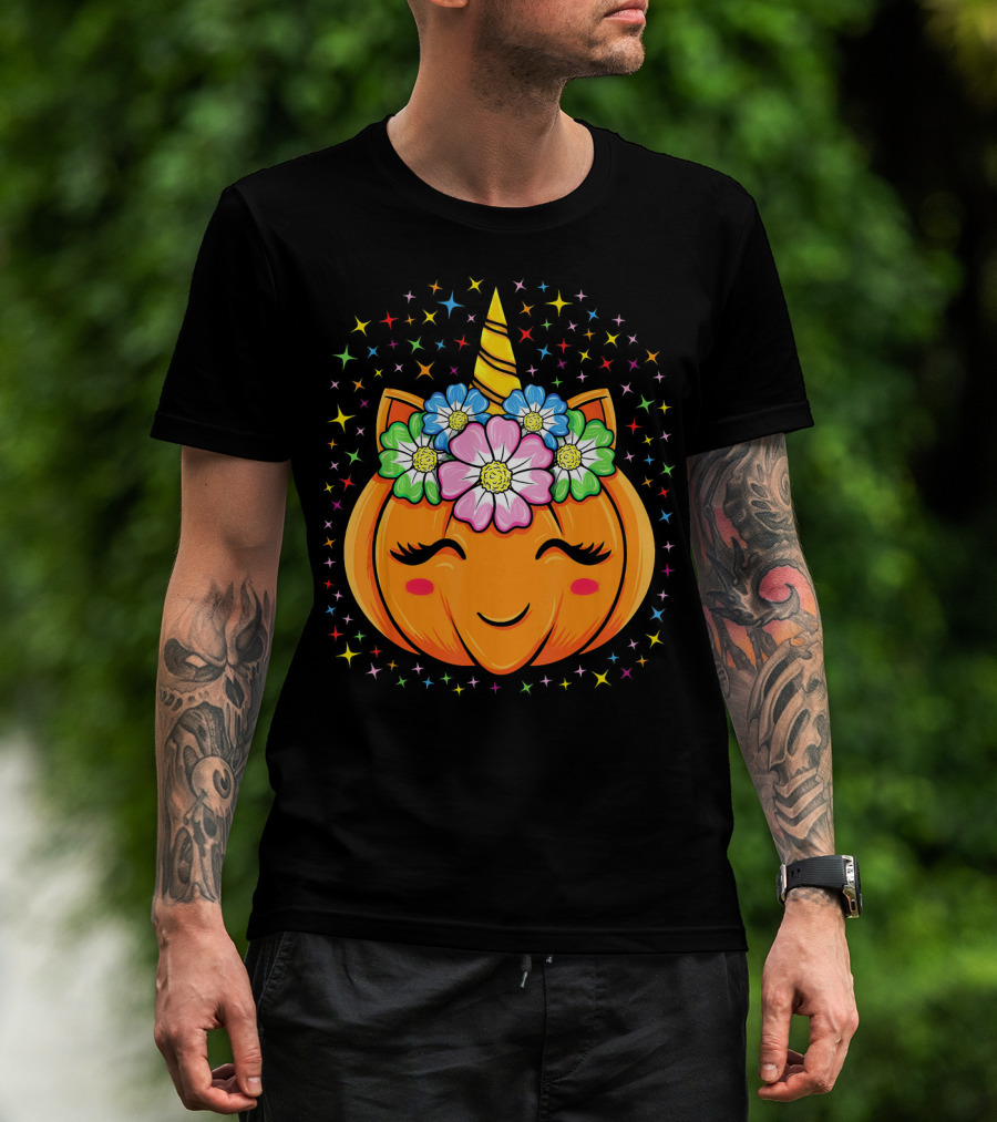 Unicorn Pumpkin Halloween Cute Floral Stars T-Shirt