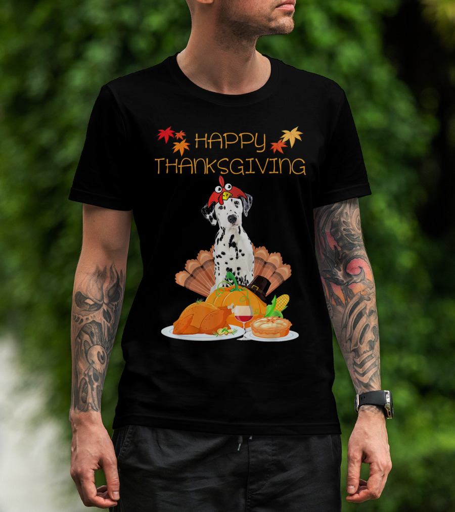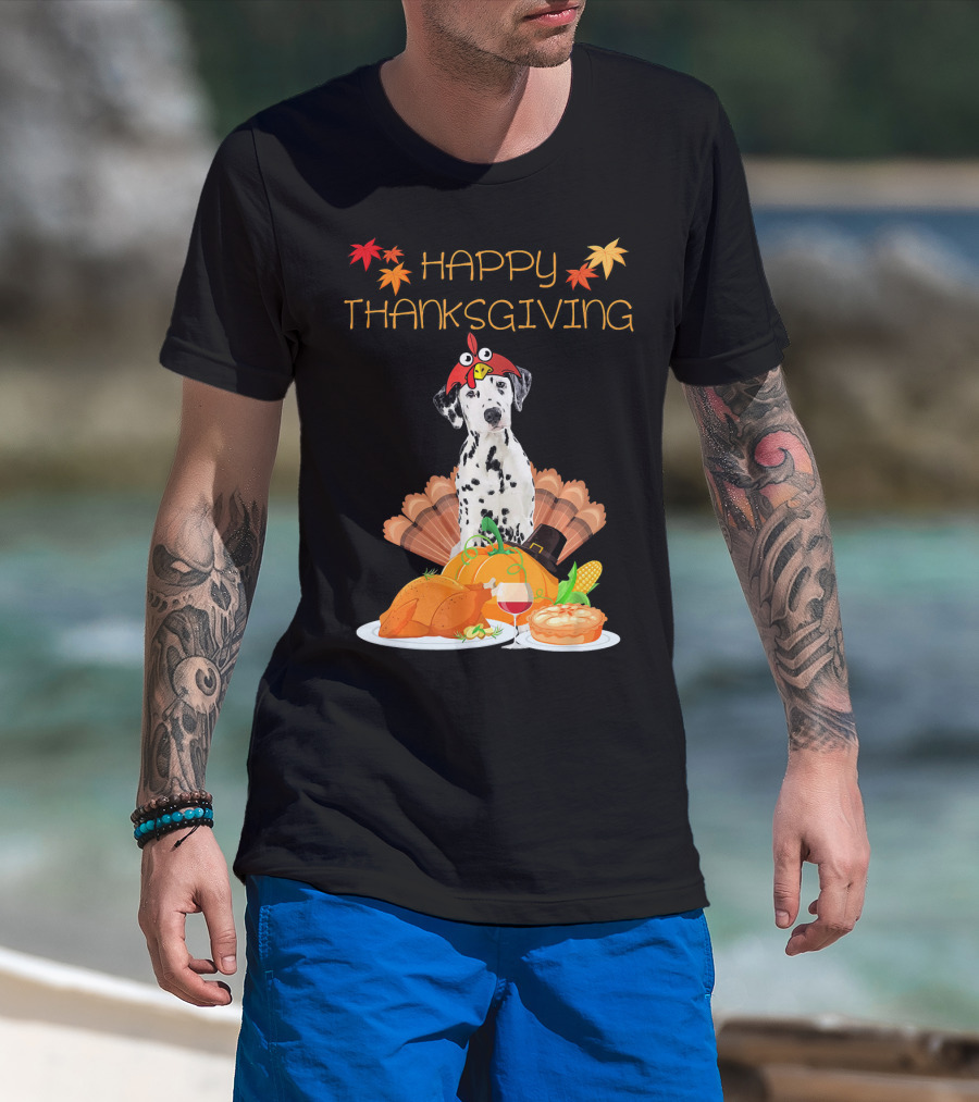 Happy Thanksgiving Dalmatian With Turkey Pumpkin Pie And Fall Leaves T-Shirt