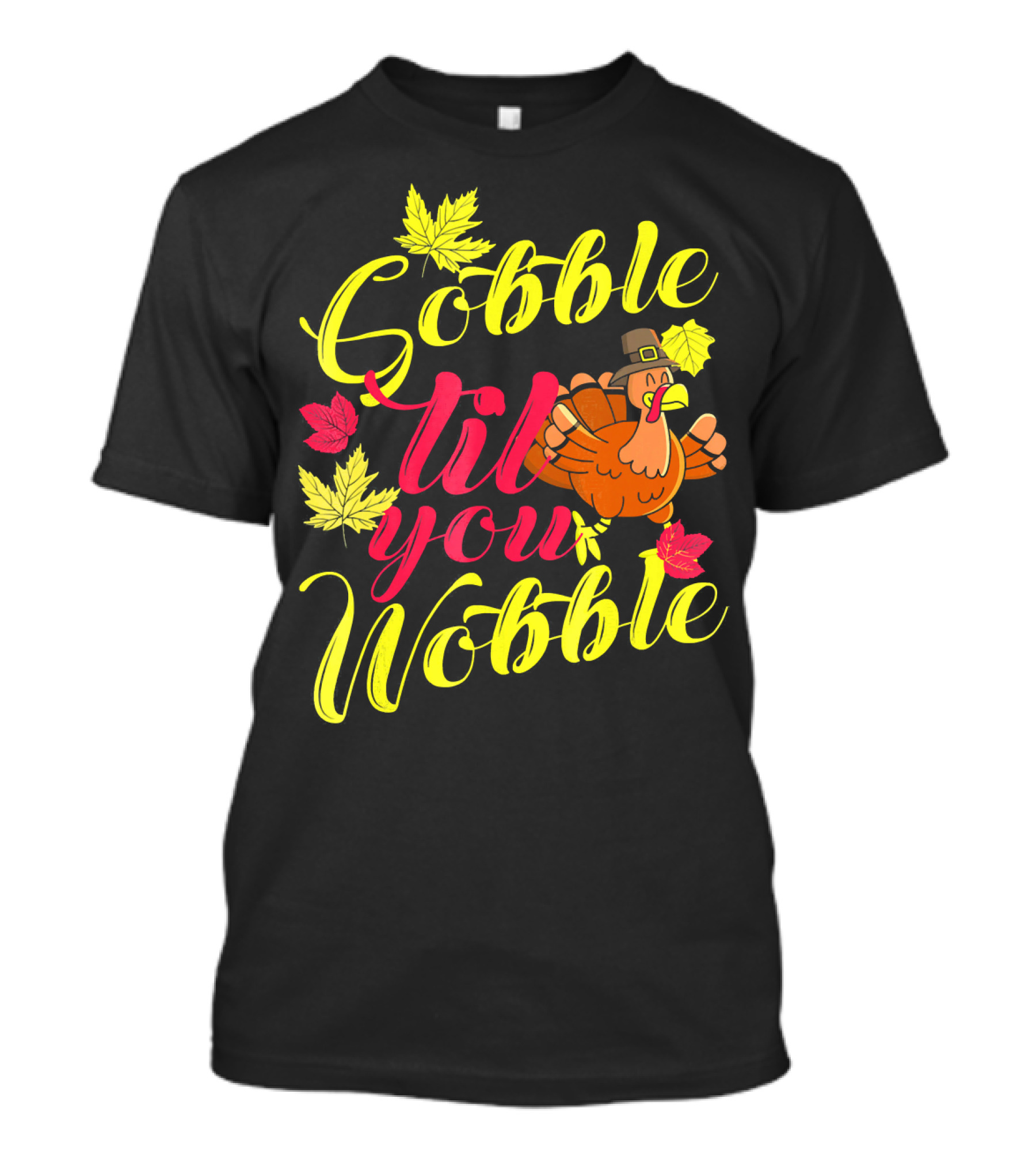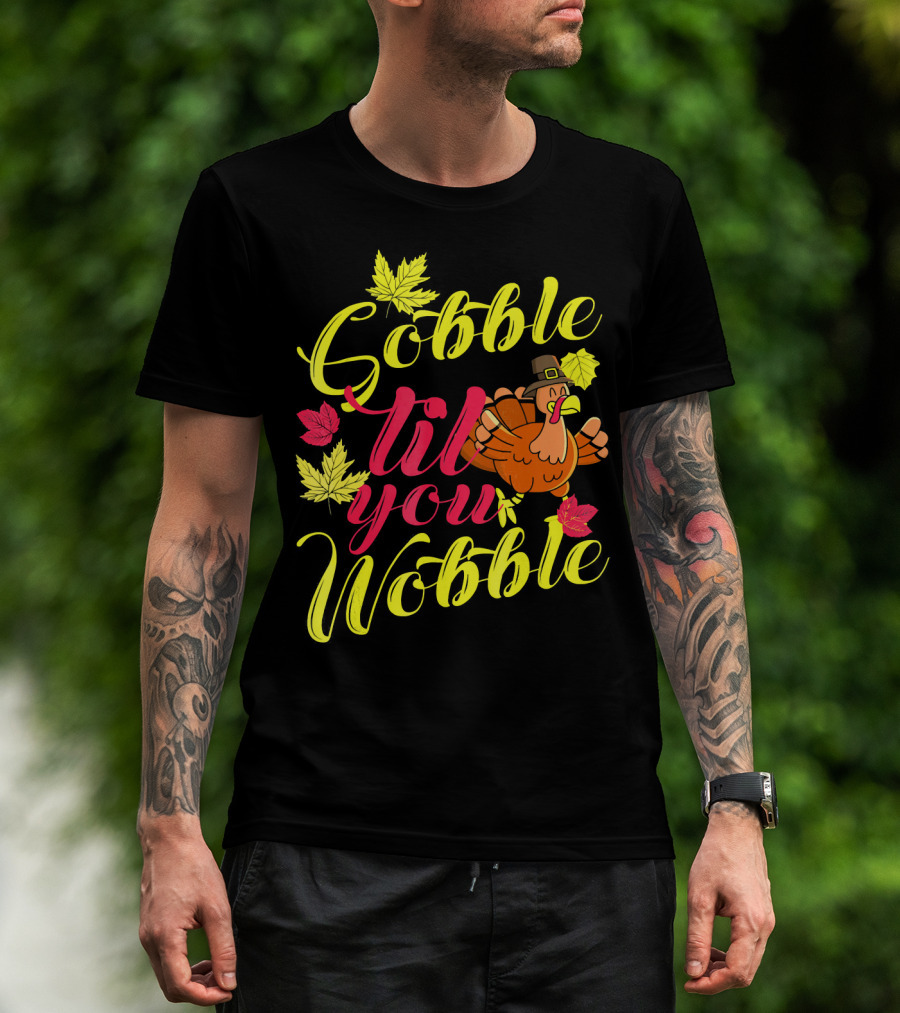 The Gobble Til You Wobble Funny Turkey with Autumn Leaves T-shirt is designed for everyday wear and a consistent fit. Fabric is pre-shrunk ring-spun cotton with durable stitching. See the size chart below for exact measurements.