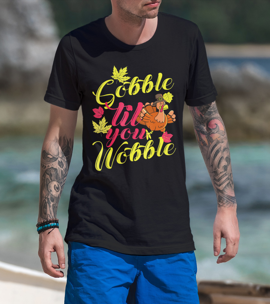Gobble Til You Wobble Funny Turkey With Autumn Leaves T-Shirt