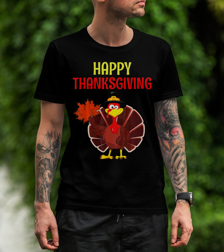 HAPPY THANKSGIVING Turkey Holding Leaf T-Shirt
