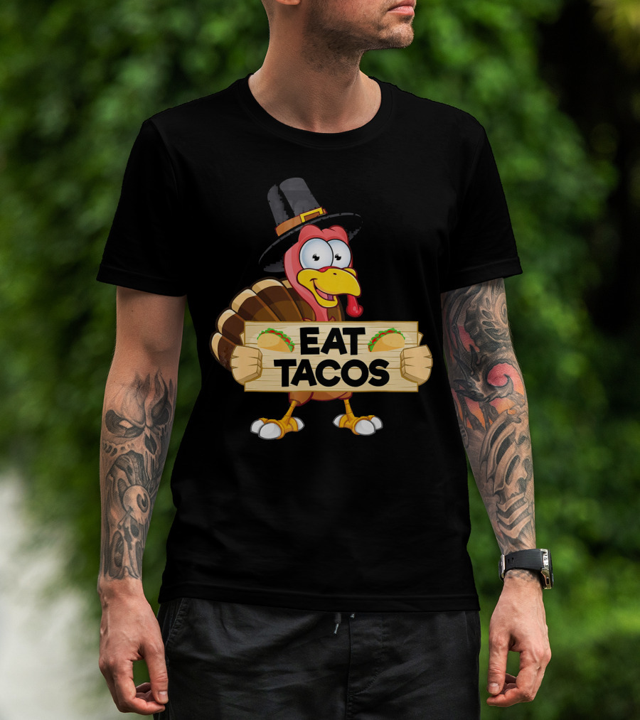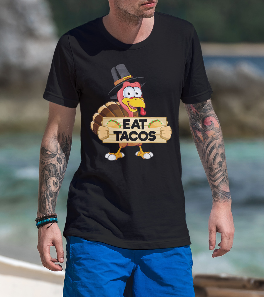 Turkey In Pilgrim Hat Holds Eat Tacos Sign Funny Thanksgiving Day T-Shirt
