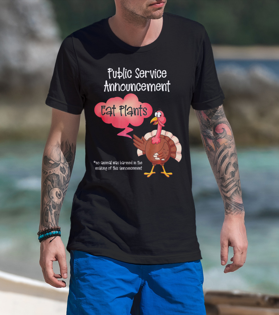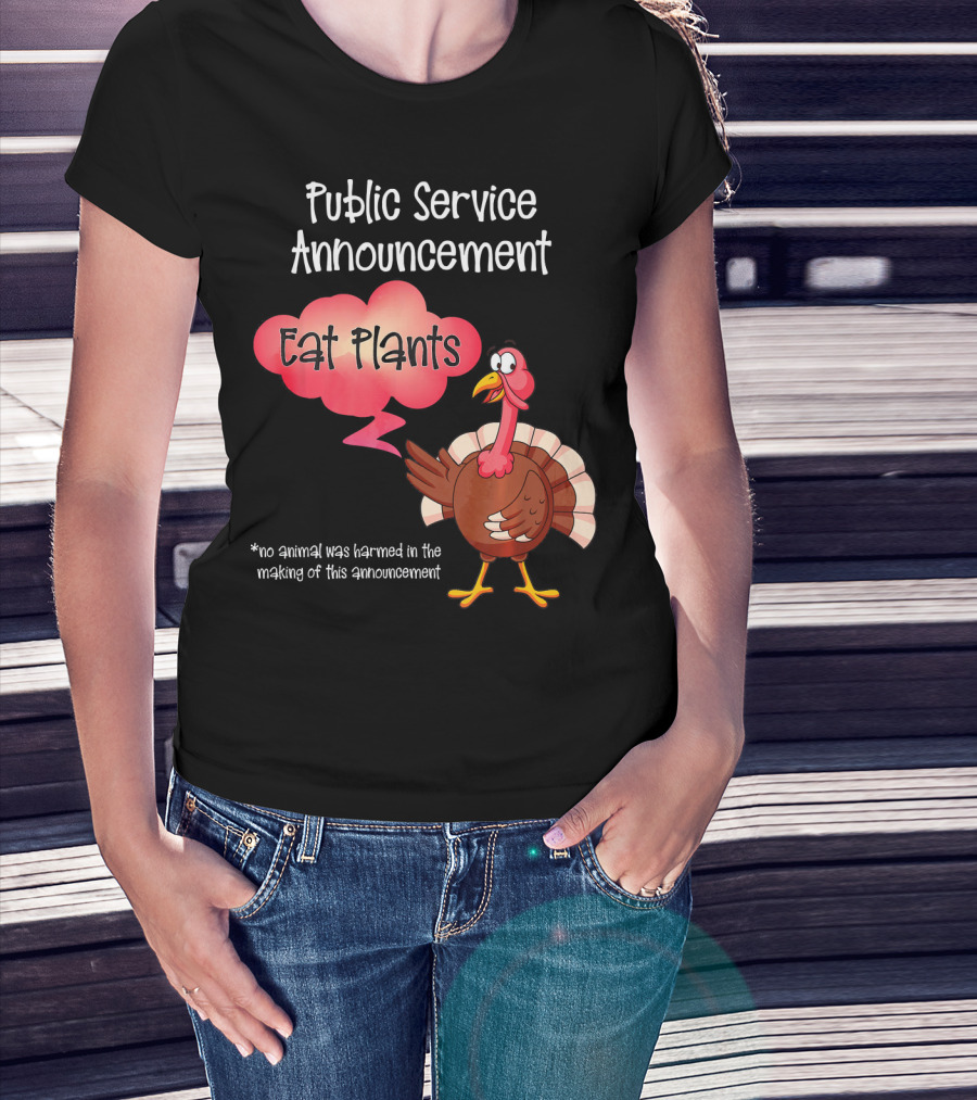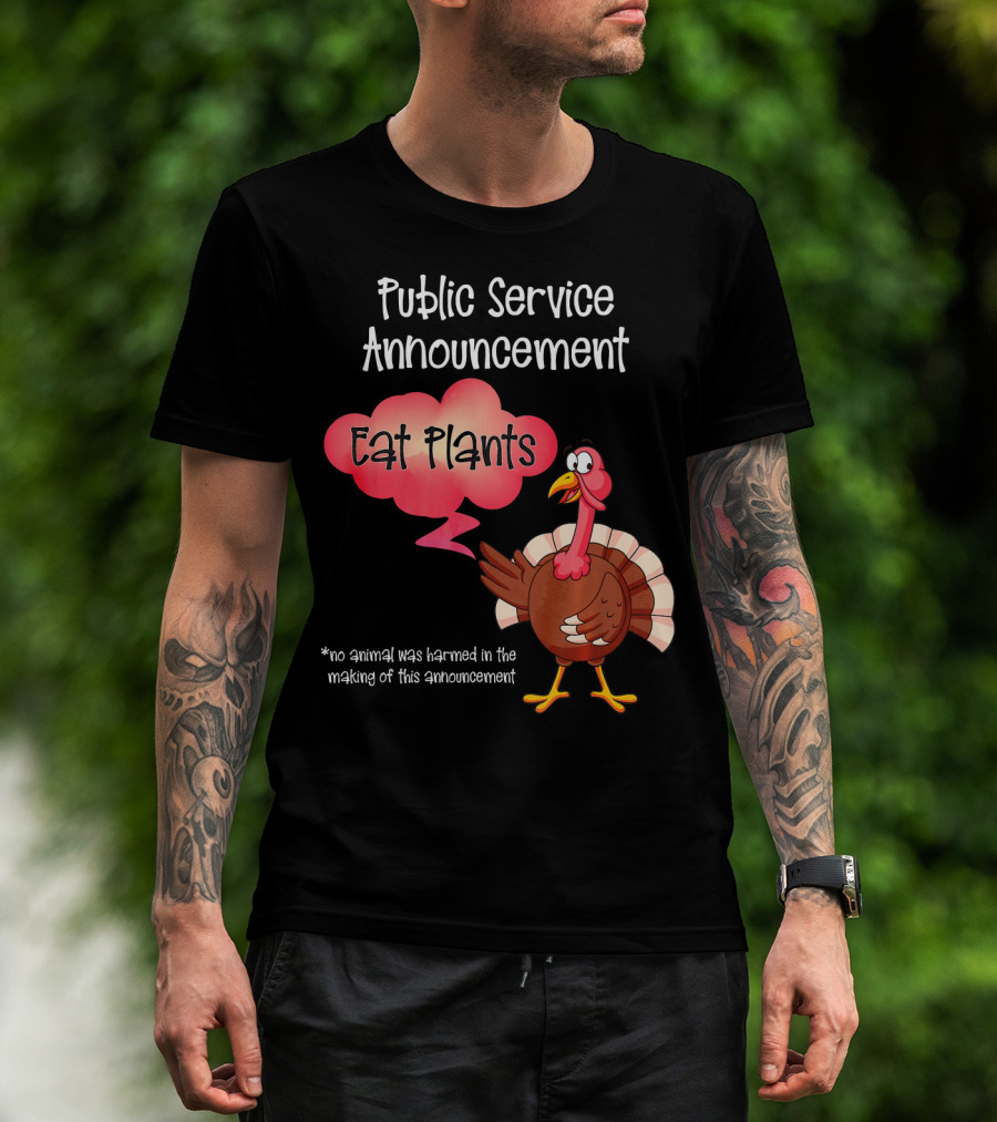 Public Service Announcement Eat Plants No Animal Harmed Funny Thanksgiving Turkey T-Shirt