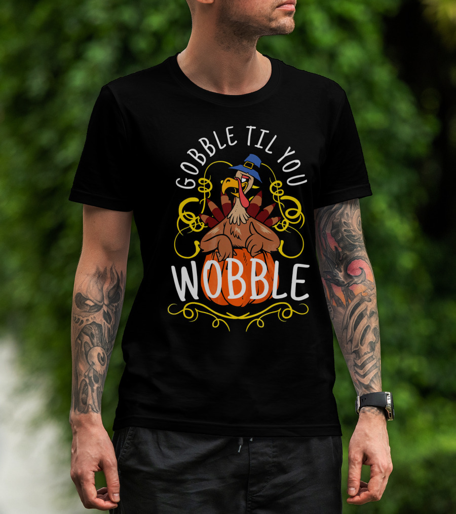 Gobble Til You Wobble Turkey With Pilgrim Hat And Pumpkin T-Shirt