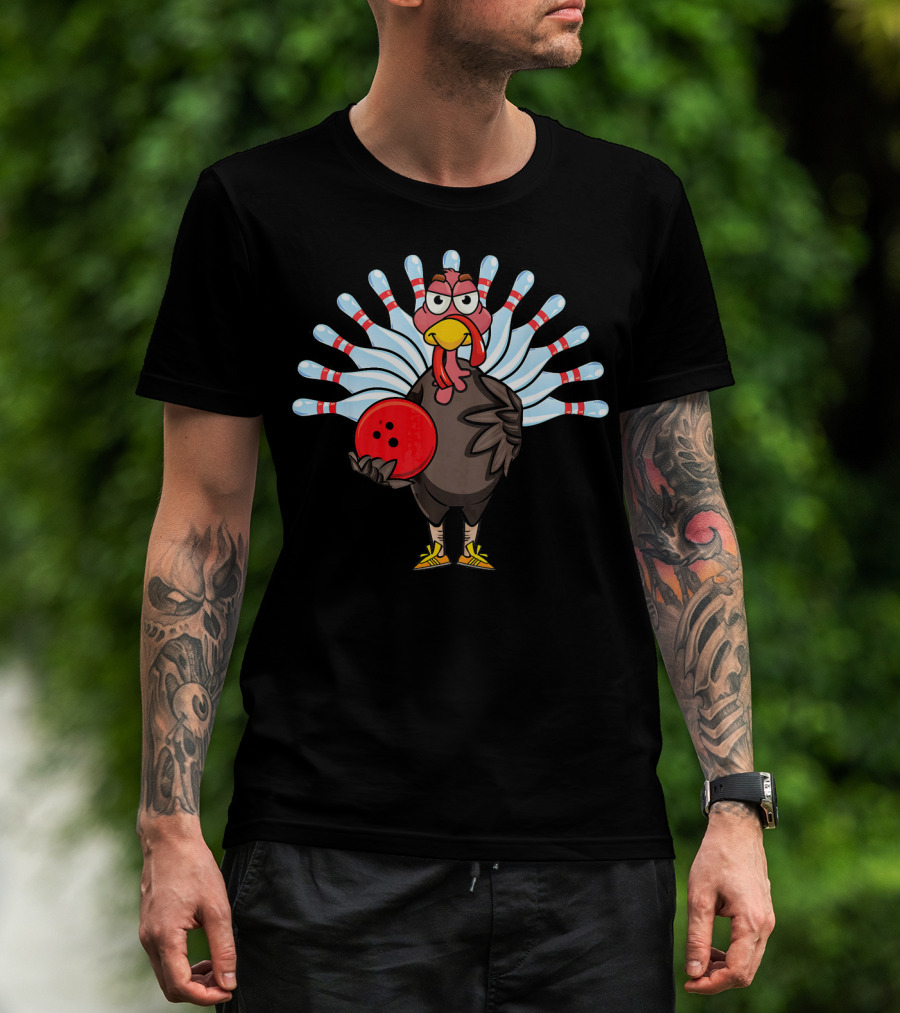 Thanksgiving Turkey Holding Bowling Ball With Pin Feathers T-Shirt