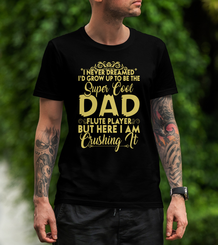 The I Never Dreamed I'd Grow Up to Be the Super Cool Dad of a Flute Player But Here I Am Crushing It T-shirt is designed for everyday wear and a consistent fit. Fabric is pre-shrunk ring-spun cotton with durable stitching. See the size chart below for exact measurements.