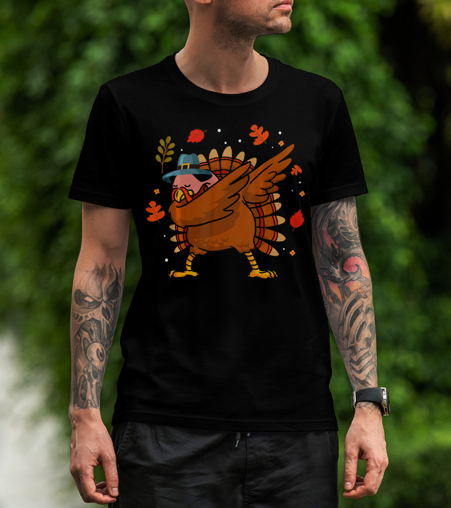 Thanksgiving Turkey Dabbing With Pilgrim Hat And Autumn Leaves T-Shirt