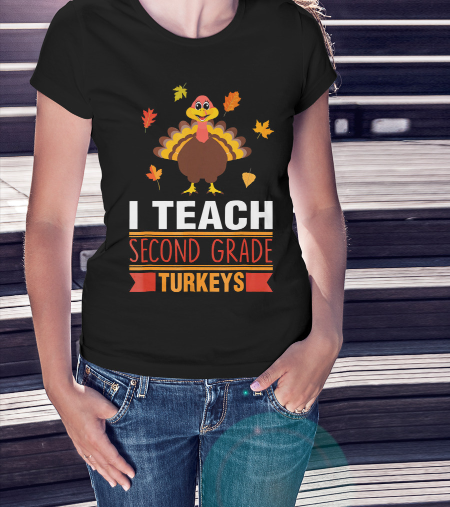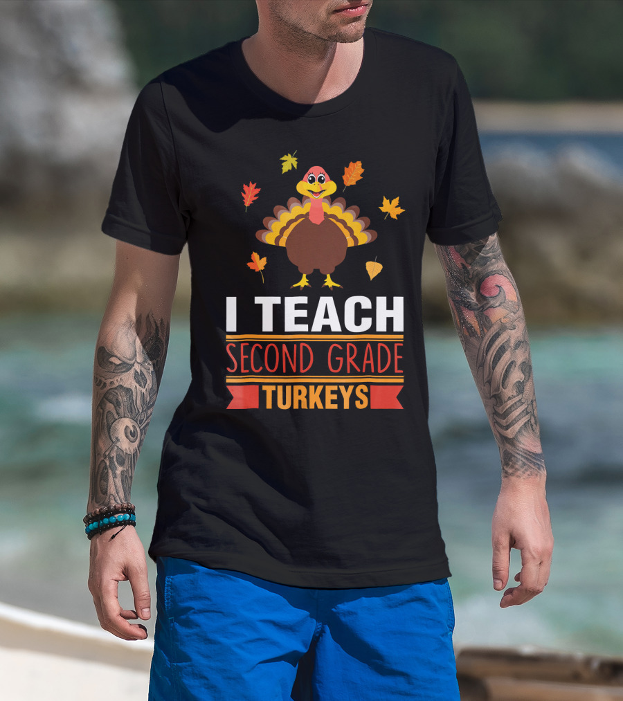 I Teach Second Grade Turkeys With Autumn Leaves And Cheerful Turkey T-Shirt