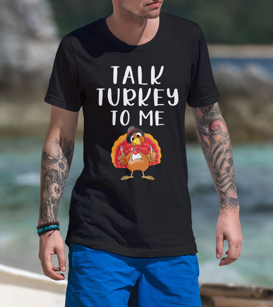 The Talk Turkey To Me Thanksgiving Humor Turkey Holding Utensils T-shirt is designed for everyday wear and a consistent fit. Fabric is pre-shrunk ring-spun cotton with durable stitching. See the size chart below for exact measurements.