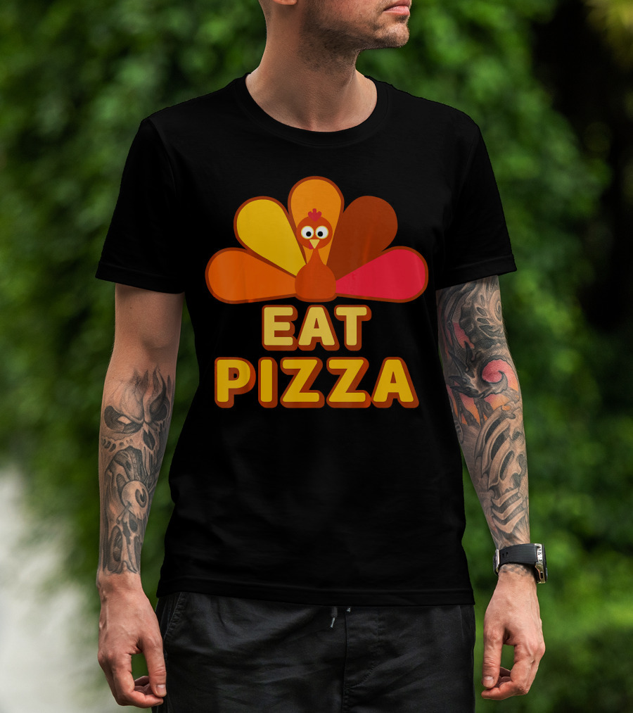 The Funny Turkey Eat Pizza Thanksgiving Humor T-shirt is designed for everyday wear and a consistent fit. Fabric is pre-shrunk ring-spun cotton with durable stitching. See the size chart below for exact measurements.