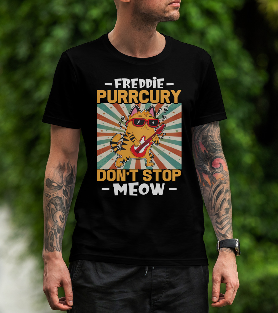 Freddie Purrcury Don't Stop Meow Cat With Guitar Retro Music Vibes T-Shirt