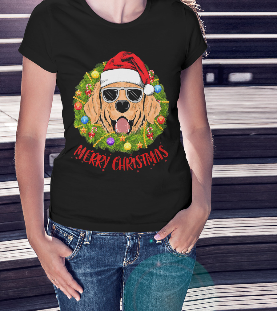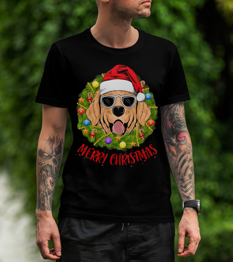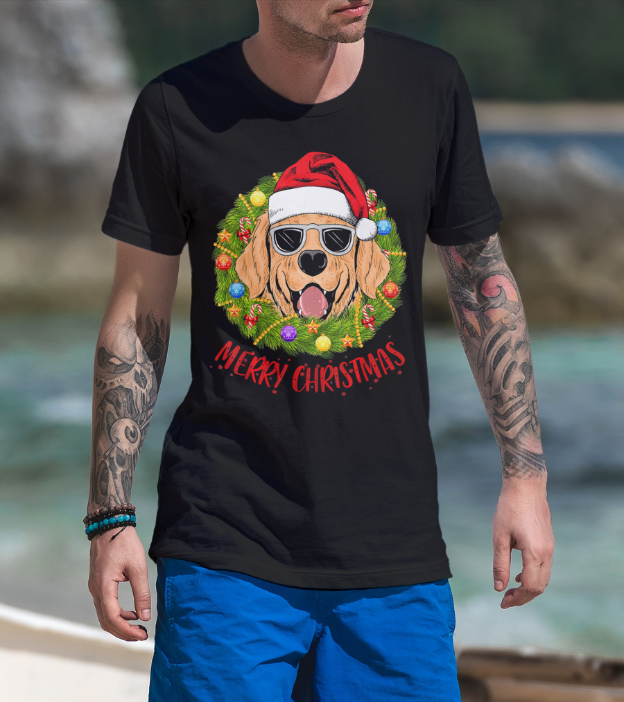 Merry Christmas Golden Retriever Dog Santa Hat Sunglasses Wreath T-Shirt