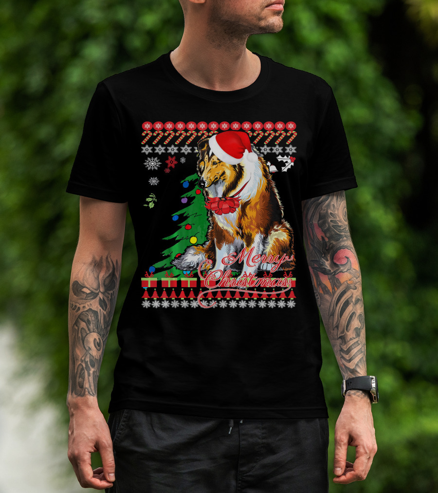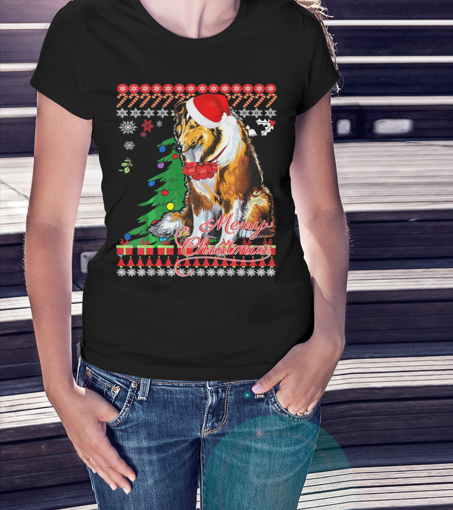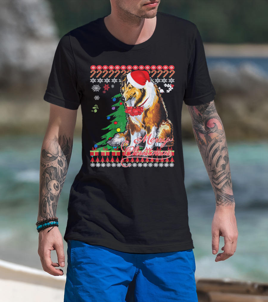 Merry Christmas Rough Collie Santa Hat Snowflakes Gifts Holiday T-Shirt