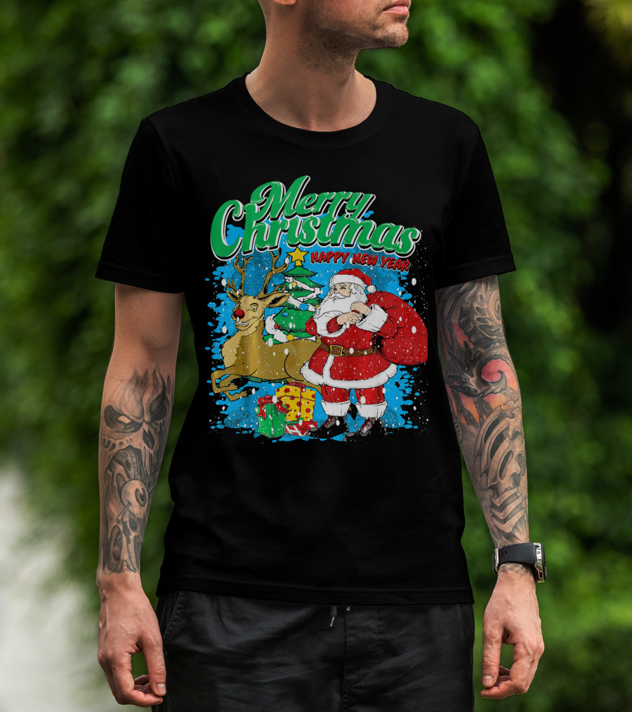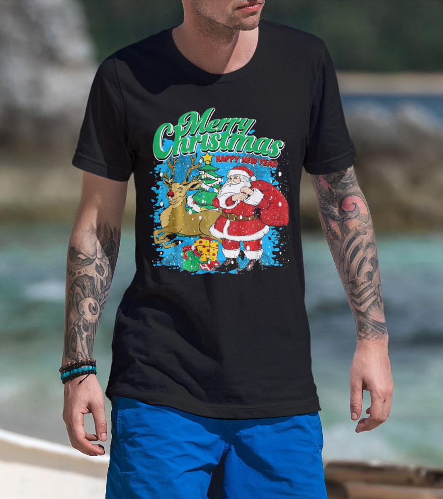 Merry Christmas Happy New Year Santa Claus Reindeer Presents T-Shirt