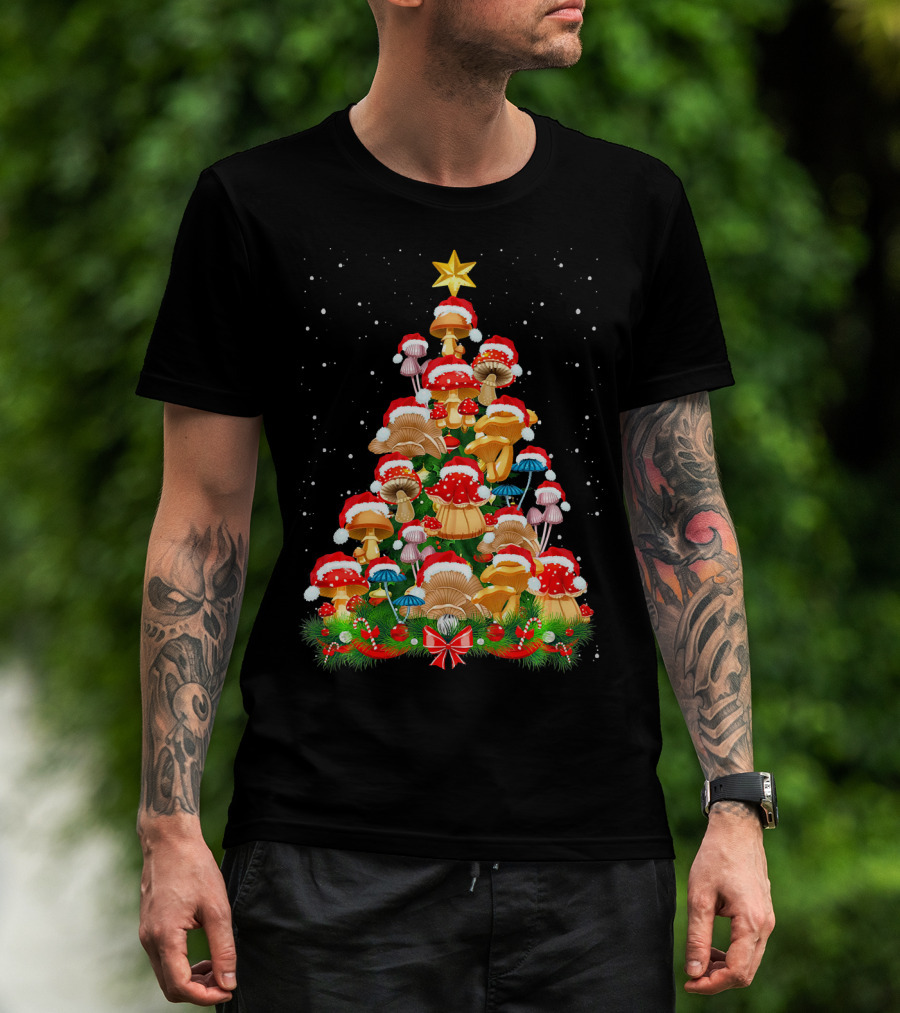 Mushroom Christmas Tree With Santa Hats And Snowflakes For Garden Lovers T-Shirt