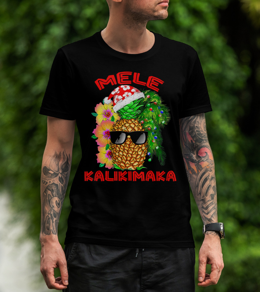 Mele Kalikimaka Hawaiian Christmas Pineapple Santa Hat Sunglasses Flowers T-Shirt