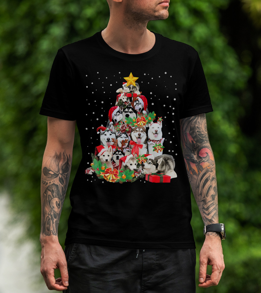 Siberian Husky Christmas Tree Festive Holiday Dogs With Gifts And Star T-Shirt