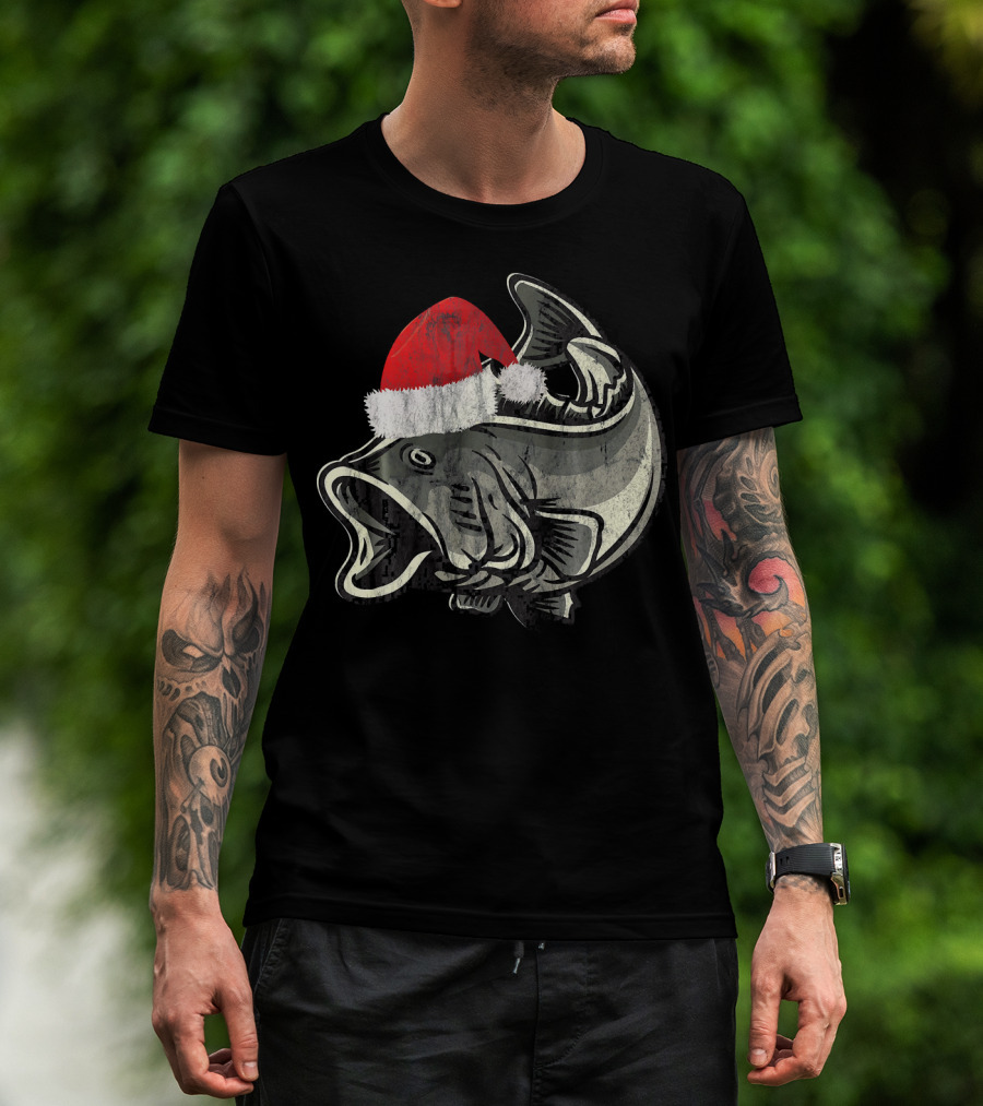 The Christmas Bass with Santa Hat T-shirt is designed for everyday wear and a consistent fit. Fabric is pre-shrunk ring-spun cotton with durable stitching. See the size chart below for exact measurements.