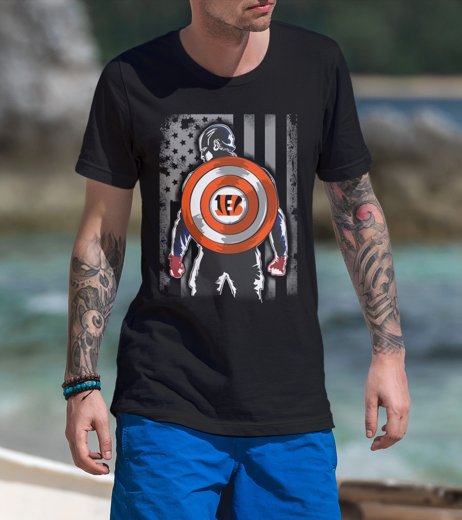 The Cincinnati Bengals Captain America Shield T-shirt is designed for everyday wear and a consistent fit. Fabric is pre-shrunk ring-spun cotton with durable stitching. See the size chart below for exact measurements.