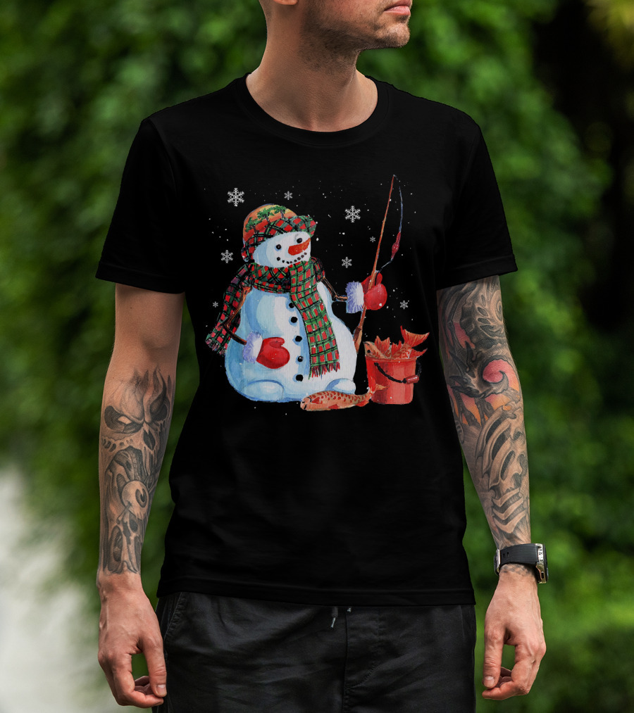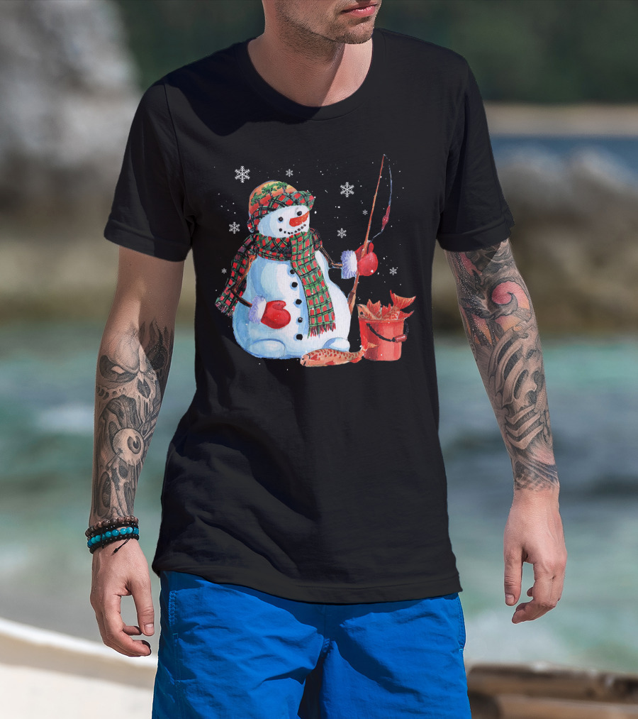 Merry Christmas Snowman Fishing With Fish And Snowflakes T-Shirt