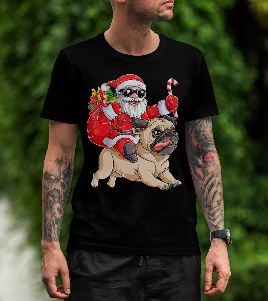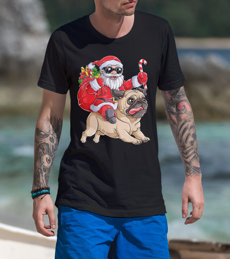 Santa Claus Riding Pug With Candy Cane And Gifts T-Shirt