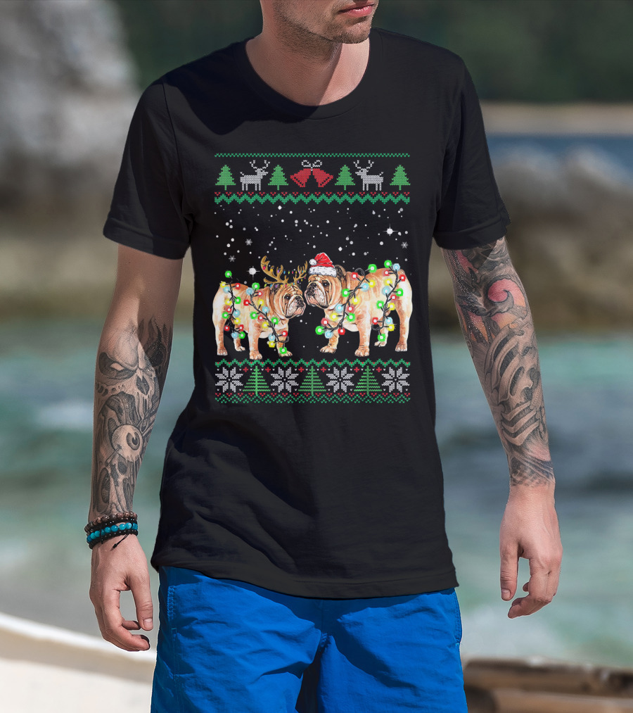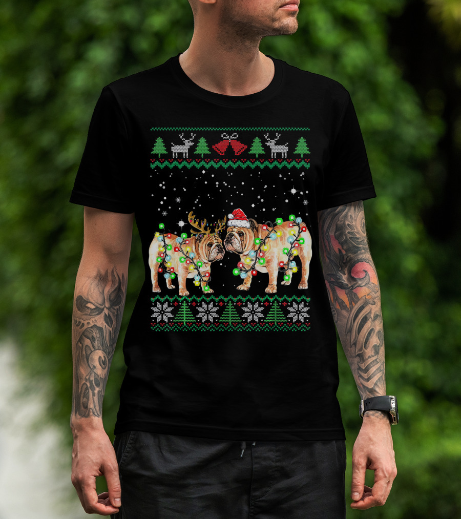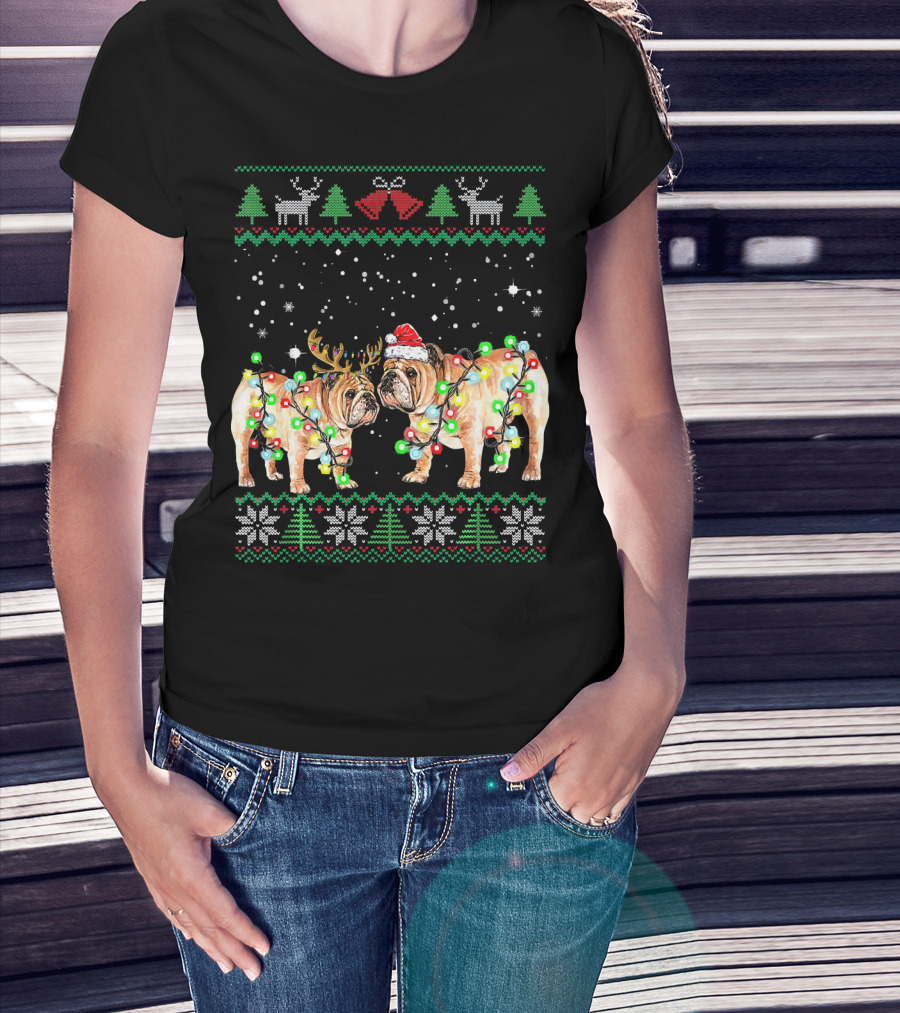 Bulldog Ugly Christmas Sweater With Santa Hat And Reindeer Antlers T-Shirt