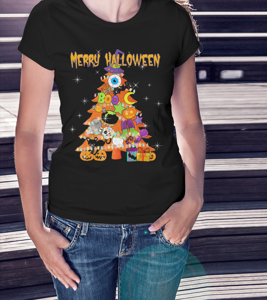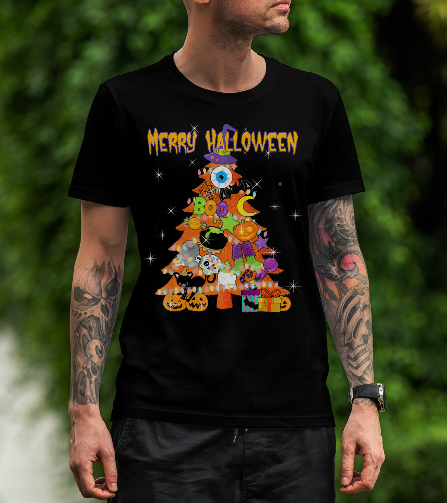 Merry Halloween Tree With Cute Boo Decorations And Spooky Elements T-Shirt