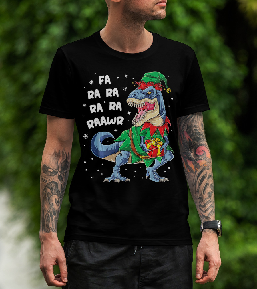 Fa Ra Ra Ra Ra Rawr Dinosaur Christmas Elf With Gift T-Shirt